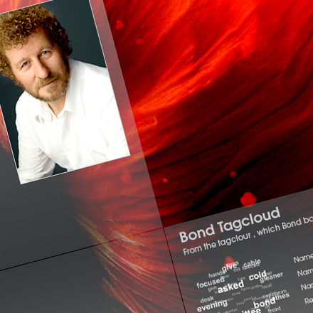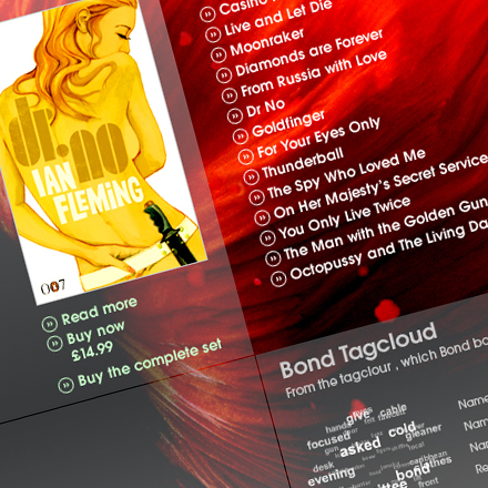 The site was produced in Flash and used many of the techniques of the time, but also new ones. I integrated a 3D rotating tag cloud as part of an interactive game. A concept I came up with to add movement to the page and a little fun for the die hard Bond fans. 'In how many words could you identify a particular Bond title?'