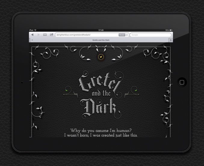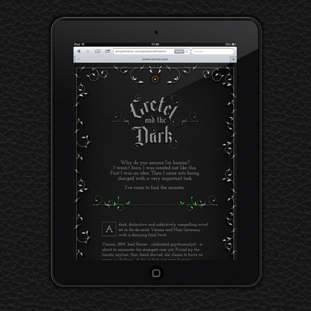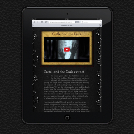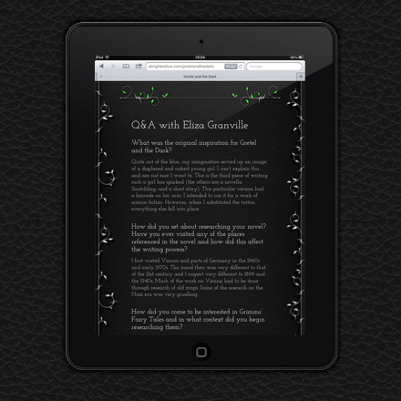 Gretel and the Dark promotion page was produced to support the launch of a new book by Eliza Granville. I had very little to work with as much was still under wraps and the book jacket was still in the final stages of sign off. Needless to say it looked like a fun project and one I was pleased to be able to offer my skills and assistance towards it... FOR FREE. Sometimes the most enjoyable projects are the ones you don't get paid for... and that's fine.
