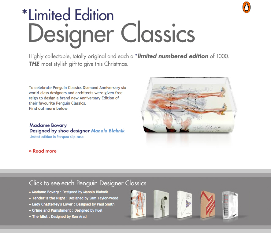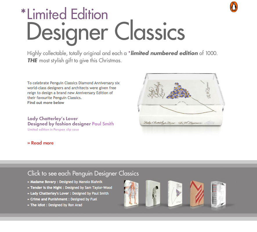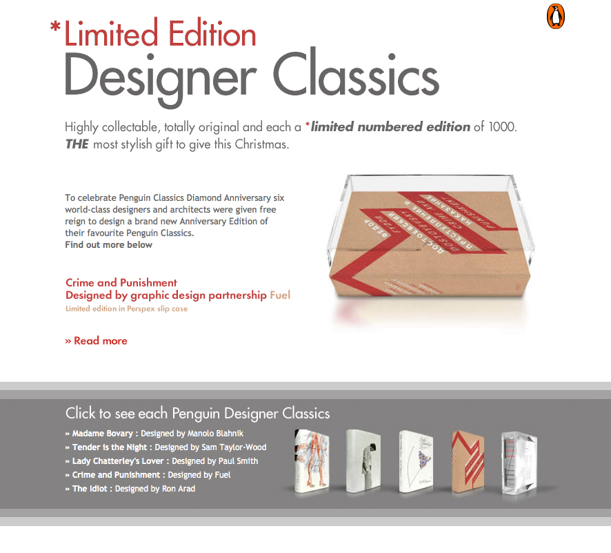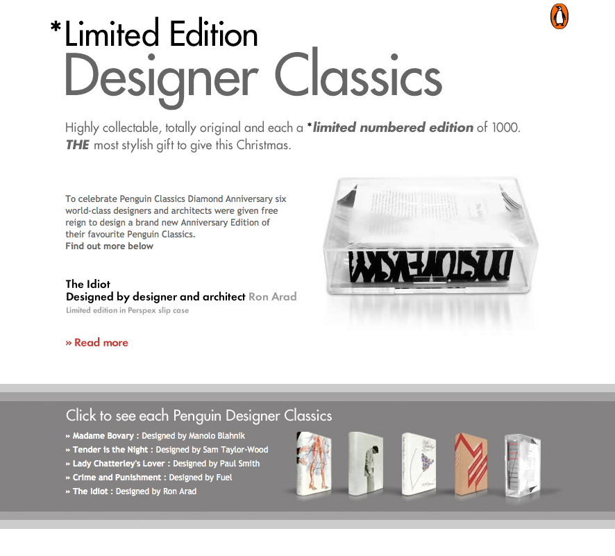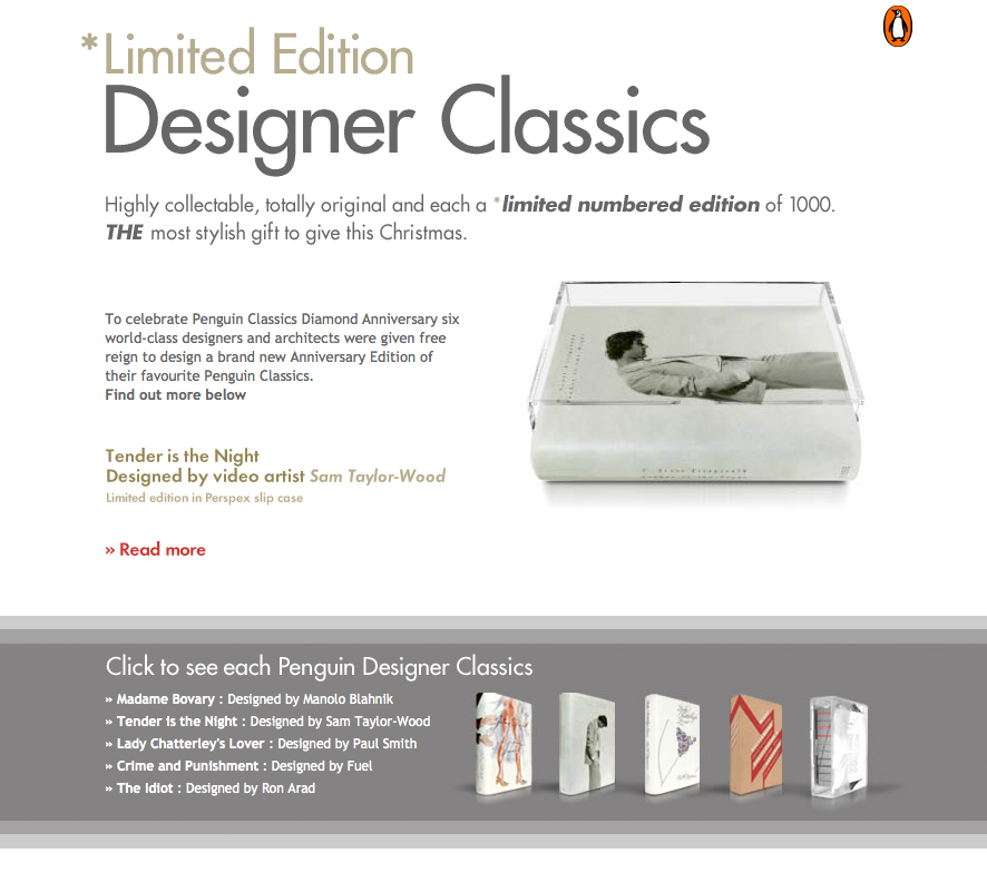I created this site to celebrate the Penguin Classics Diamond Anniversary. Five world-class designers and architects were given free reign to design a brand new Anniversary Edition of their favourite Penguin Classics.